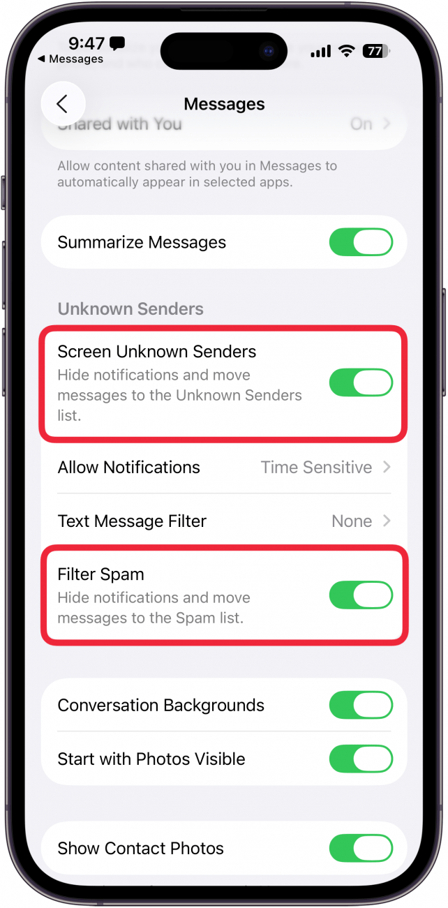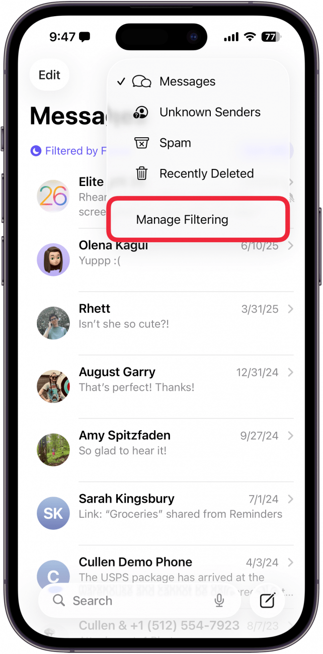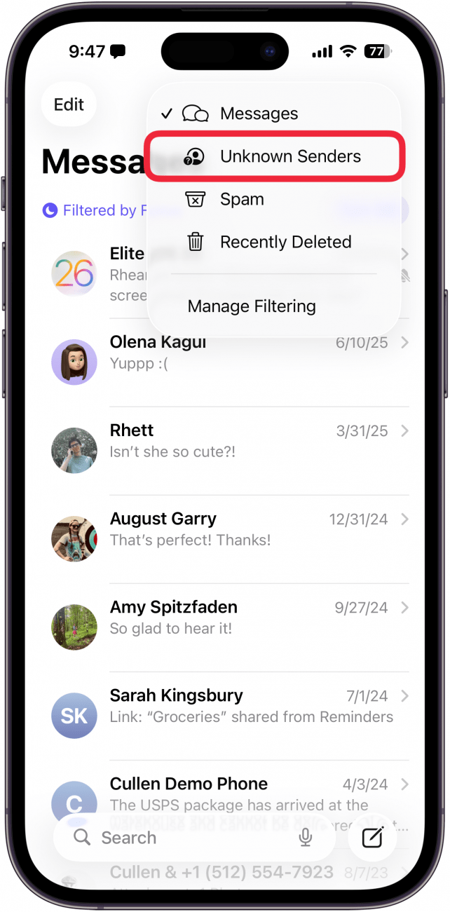 这就是如何阻止 iPhone 上的垃圾短信!现在,您可以选择打开“消息”应用程序,只查看来自您认识的人的消息。另外,您仍然可以在需要时查看未知发件人。如果您的 iPhone 运行的是 iOS 18 或更早版本,则会调用“屏幕未知发件人”设置过滤未知发件人,但该功能的工作方式基本相同。在早期版本的 iOS 上,您会看到过滤器按钮在“消息”应用程序中,您可以找到未知发件人和最近删除消息。