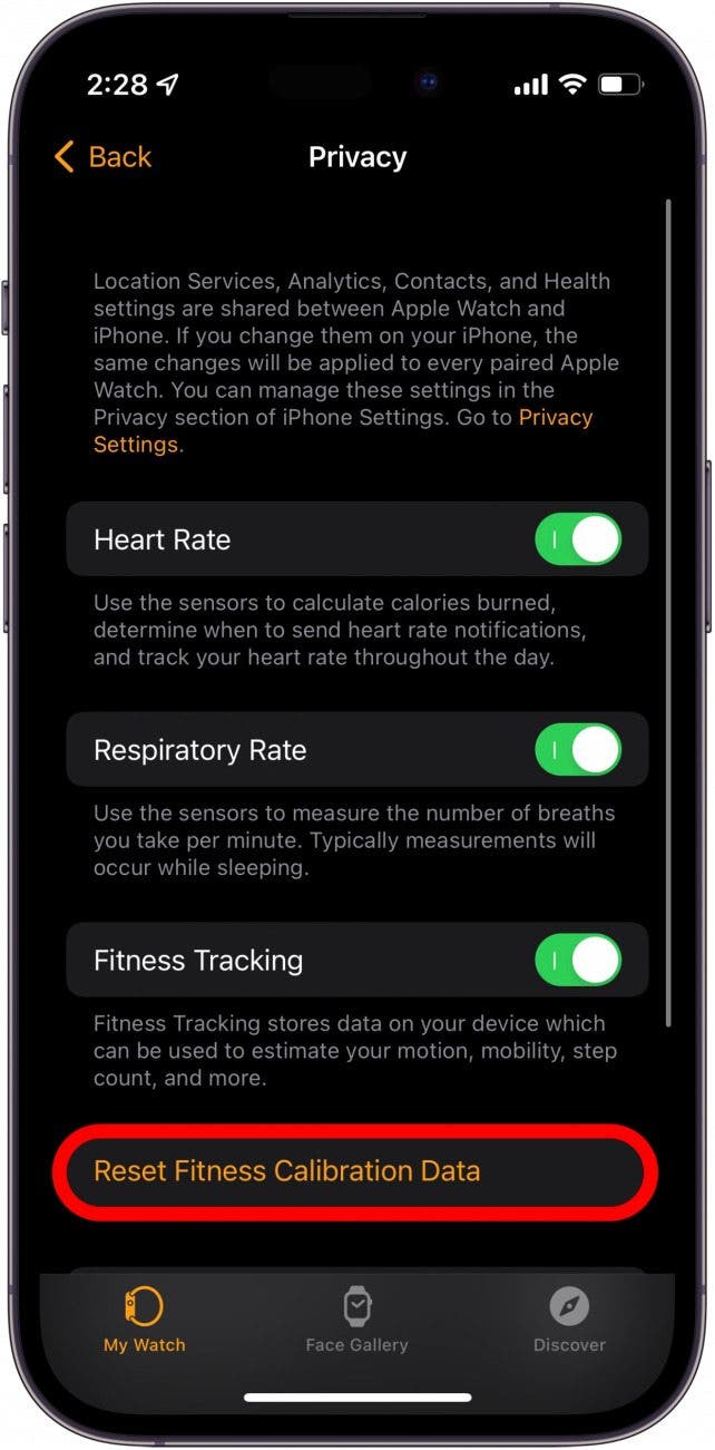 如果上述解决方案未能解决您的 Apple Watch 无法准确跟踪活动或计算步数的问题,最终的解决方案是重新校准您的 Apple Watch 健身数据。此选项将擦除所有以前收集的健身数据和历史记录。在重新校准您的 Apple Watch 之前,在记录您的活动时还可能会导致其他不一致的情况。因此,在尝试修复 Apple Watch 不计算步数的问题时,重置健身数据应该是最后的选择。完成此过程后,请务必按照上一节中的步骤校准您的 Apple Watch。以下是重置您的健身校准数据的方法: