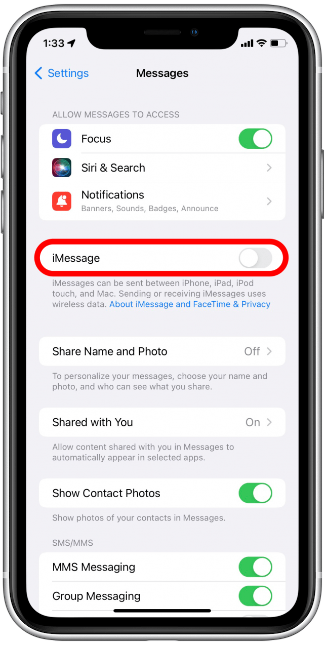 - 如果您看到短信转发,请跳至步骤 8。如果您没有看到此选项,请向上滚动并选择关闭 iMessage。