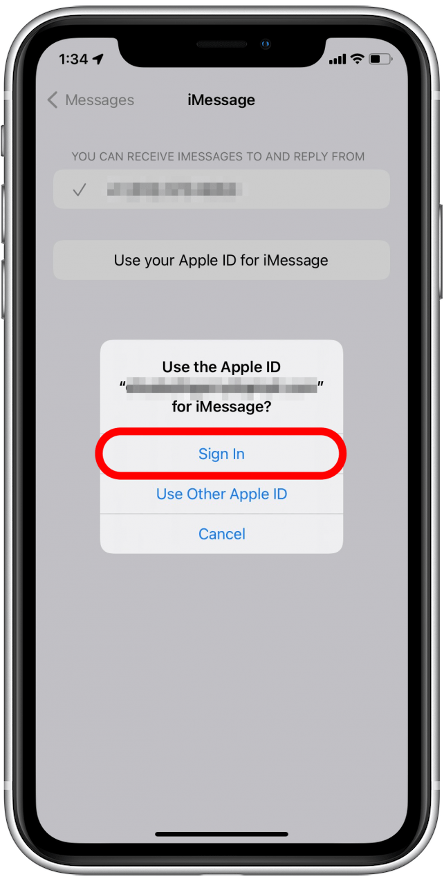 - 轻敲登入弹出窗口询问您是否愿意使用您的 Apple ID 来发送 iMessage。