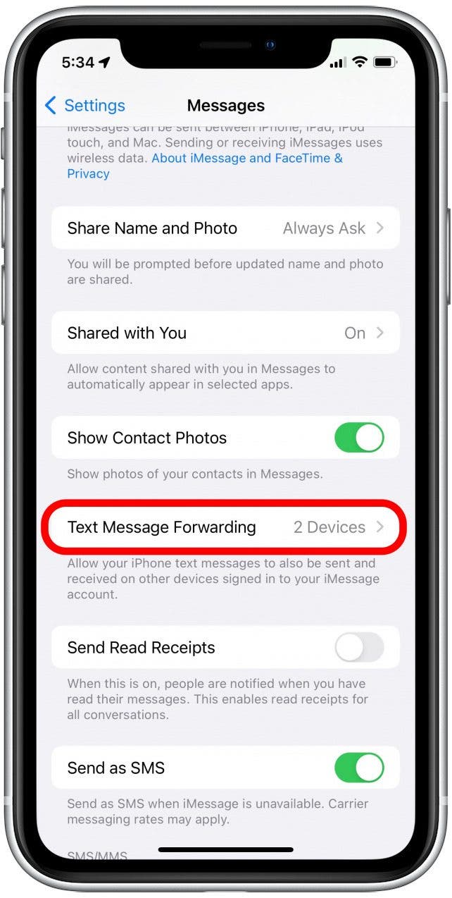 - 点击消息返回“设置”。您现在应该会看到短信转发选项。