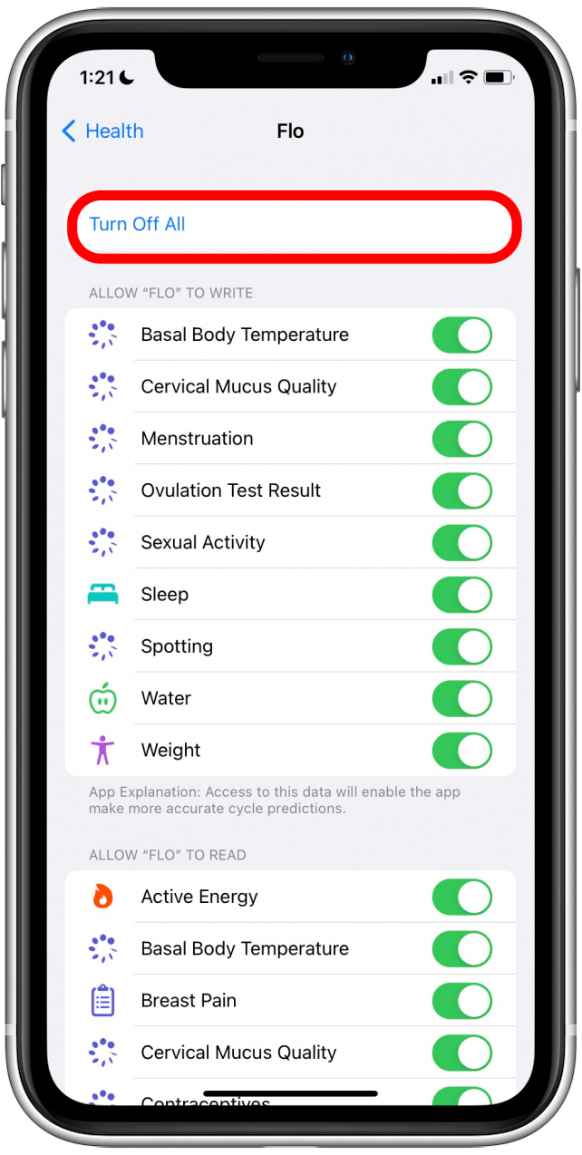 - 轻敲关 全部以停止共享所有经期跟踪数据,或点击特定切换以停止共享某些数据,例如月经或基础体温。 (您看到的具体选项将根据您使用的第三方应用程序而有所不同。)