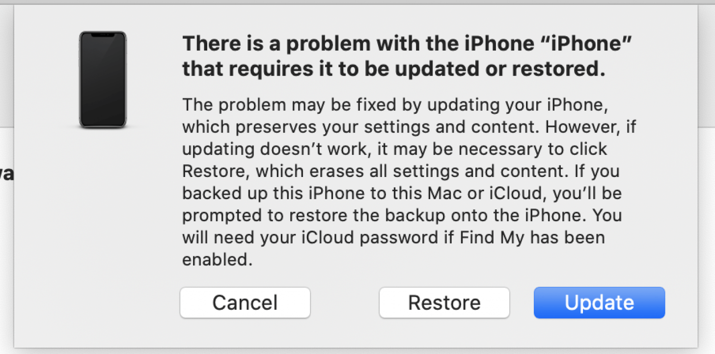- 将您的设备置于恢复模式。对于配备面容 ID 的 iPhone:快速按下并释放调高音量, 然后调低音量按钮,然后按住顶部按钮直到您的平板电脑进入恢复模式。对于 iPhone XS 及更高版本:快速按下并释放调高音量, 然后调低音量按钮,然后按住侧边按钮直到您的手机进入恢复模式。
