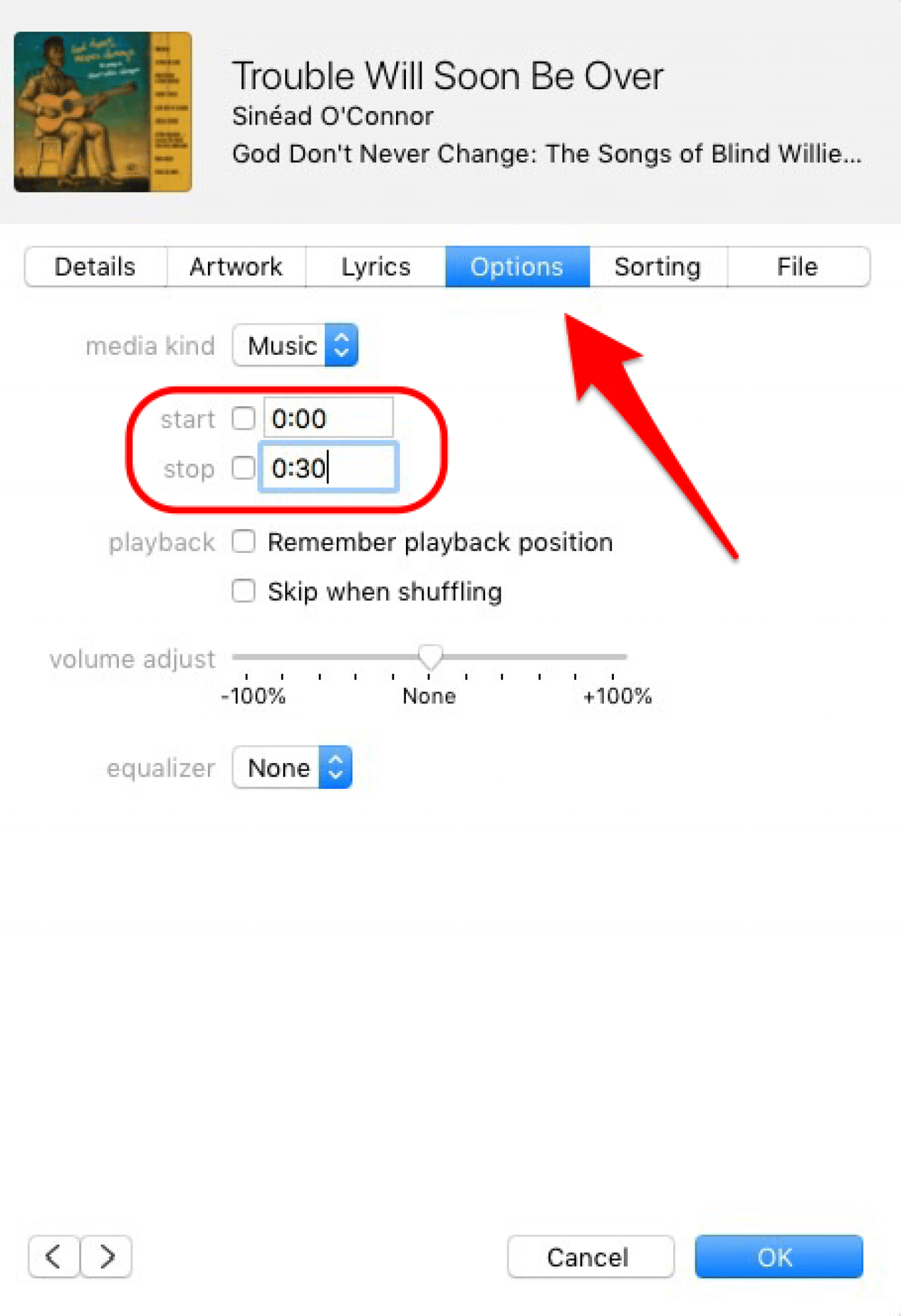 - 创建 AAC 版本后,您应该返回到歌曲的原始副本,并确保未选中开始和停止时间。 (否则,每次播放歌曲时您都只能听到歌曲中选定的 30 秒。)