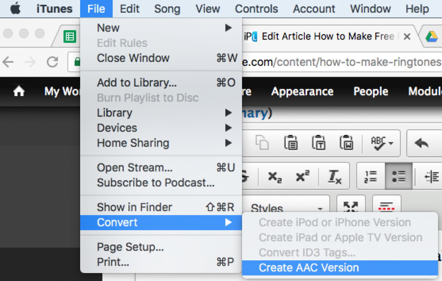 - 要转换文件类型,请转到“文件”并单击“转换”。然后选择创建 AAC 版本。