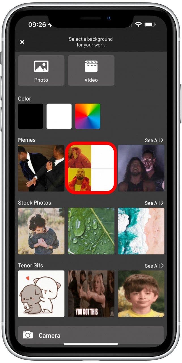 - 在最底部您可以点击相机拍照来创建你的模因。