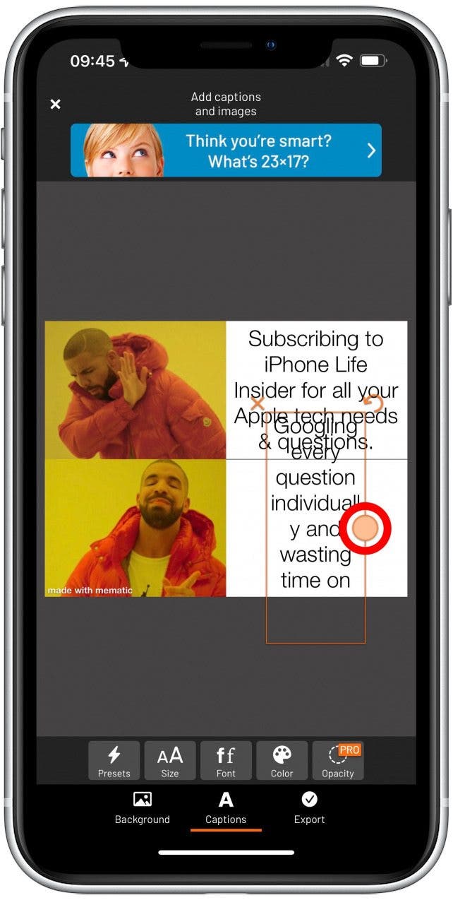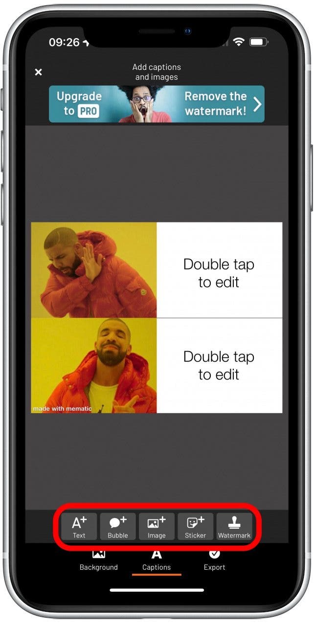 - 最上面一行可让您选择模因的外观以及文本的位置。左右滑动即可查看各种选项。