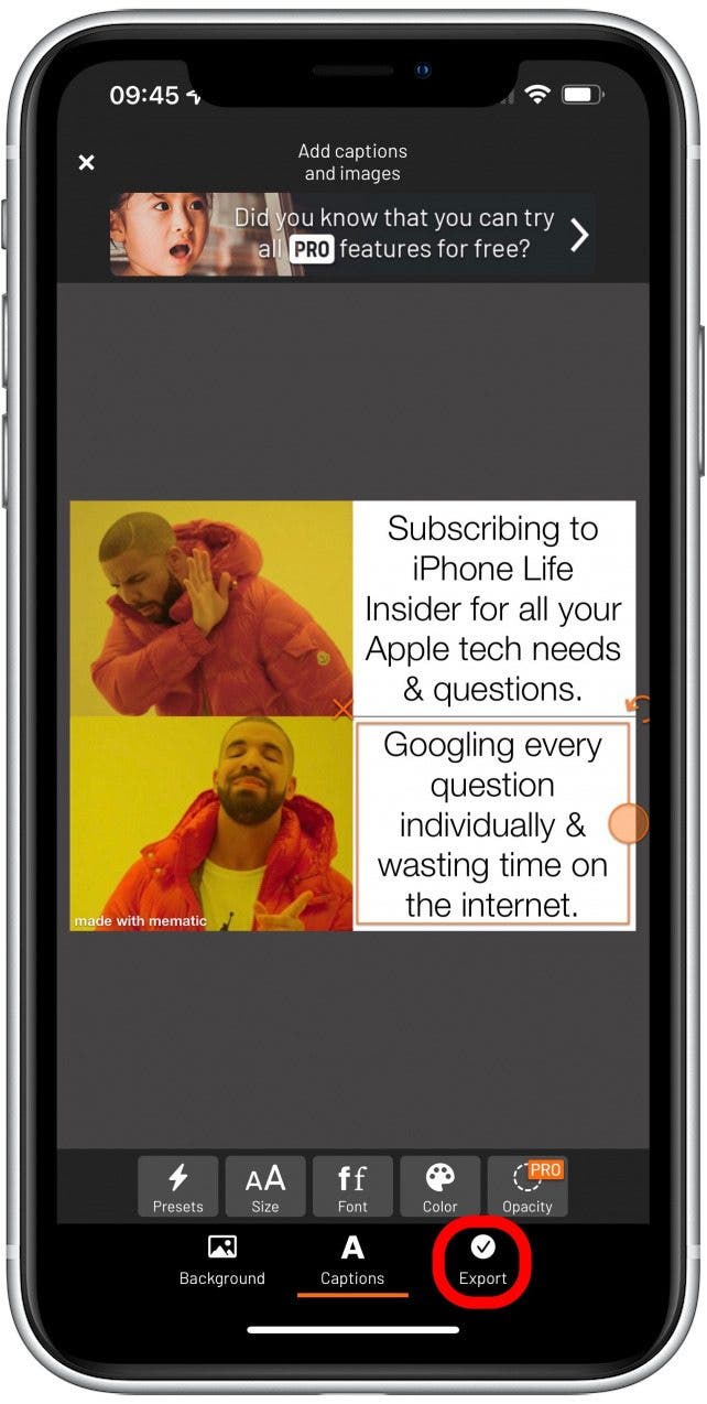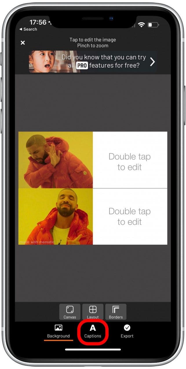 专业提示:我喜欢 Mematic - The Meme Maker,因为它可以用来制作 gif、拼贴画以及在照片上添加文字,因此它还可以兼作照片编辑器!熟悉所有功能可能需要一些时间,但它非常易于使用,而且免费版本足以满足您所有模因生成器的需求。