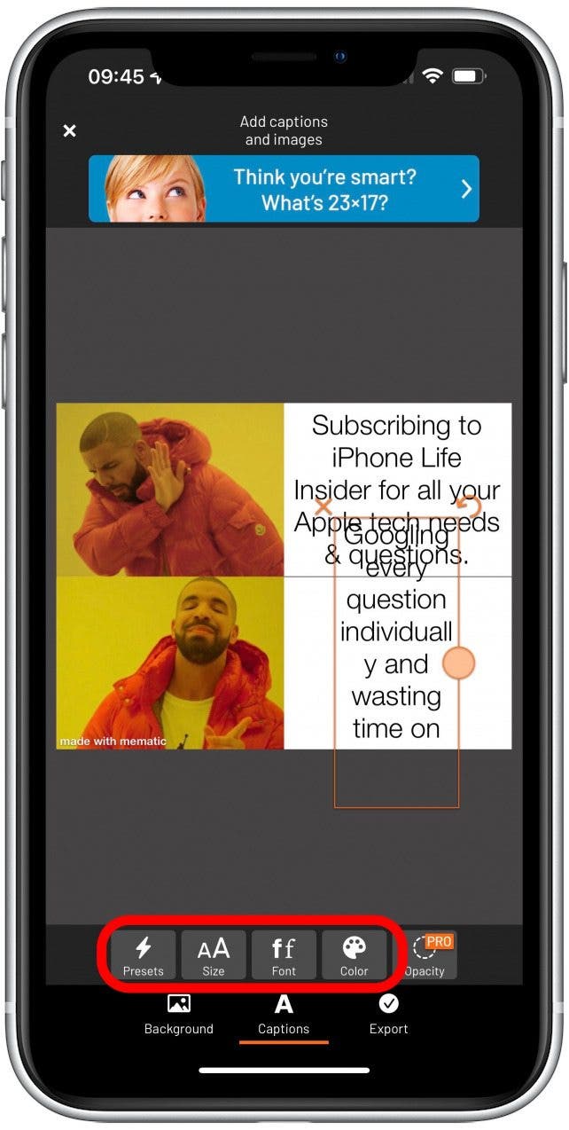 - 您还可以使用预设、大小、字体和颜色进一步自定义模因。