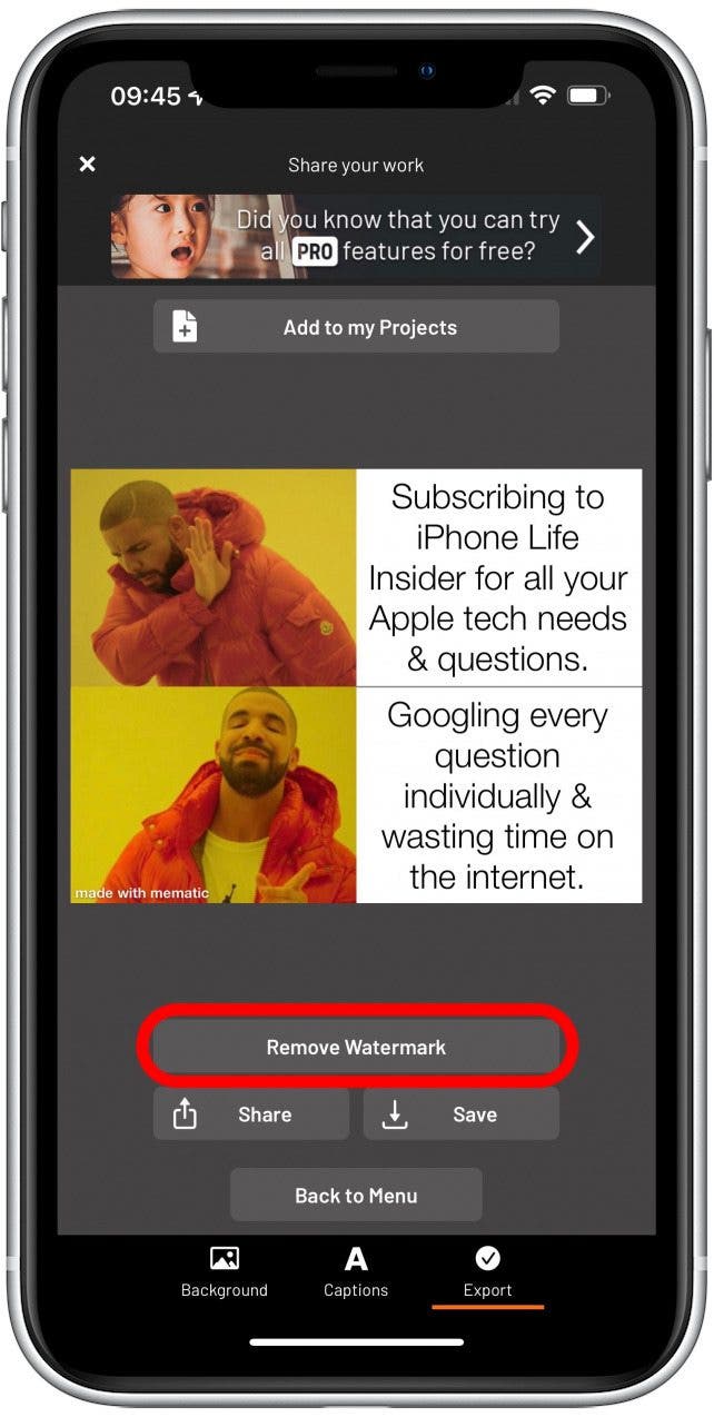 - 在这里你会看到选项删除水印,它消除了您可以在图像上看到的用模因文本制作的小文本。