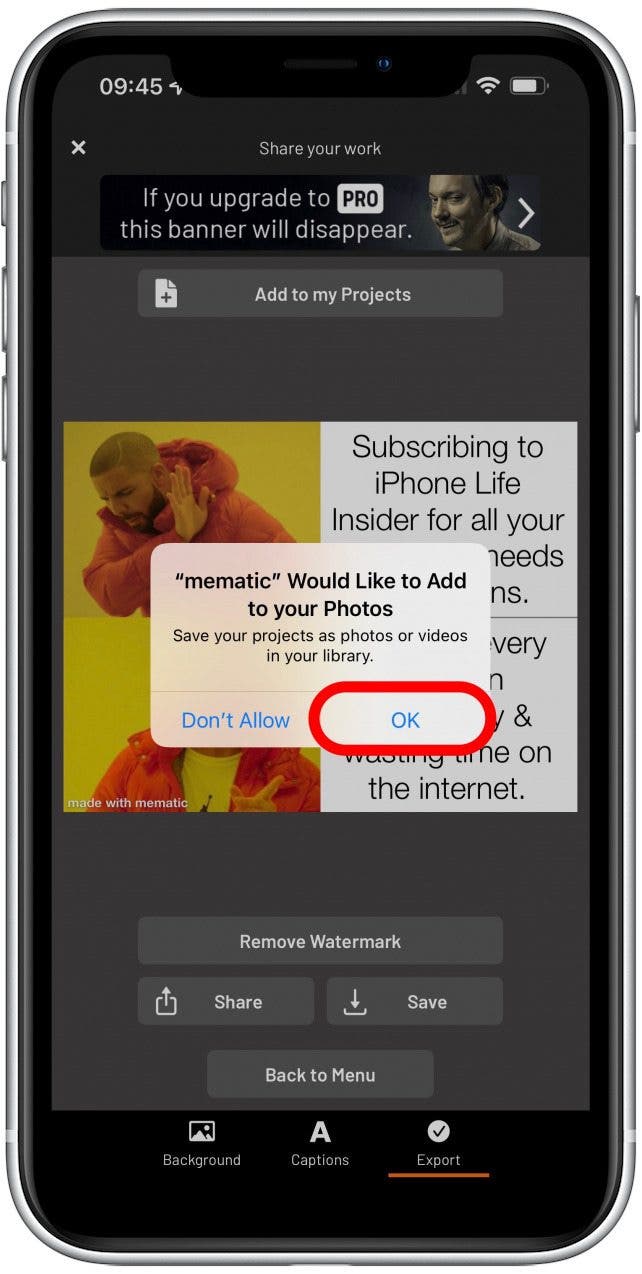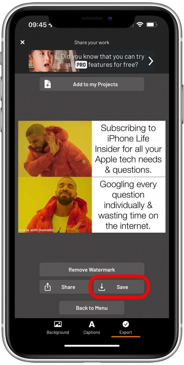 - 要将模因保存到您的照片应用程序,请点击节省。