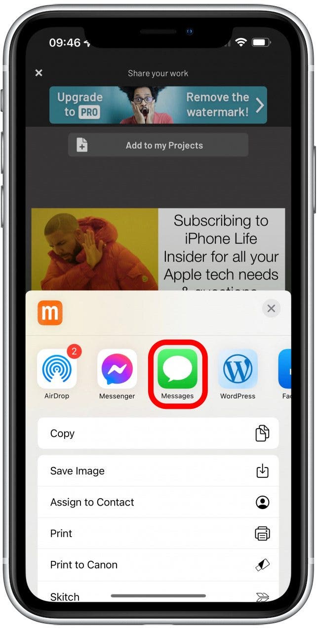 - 您可以在这里将其发送给朋友和家人,或发布到网上。例如,要通过文本发送,请点击留言。