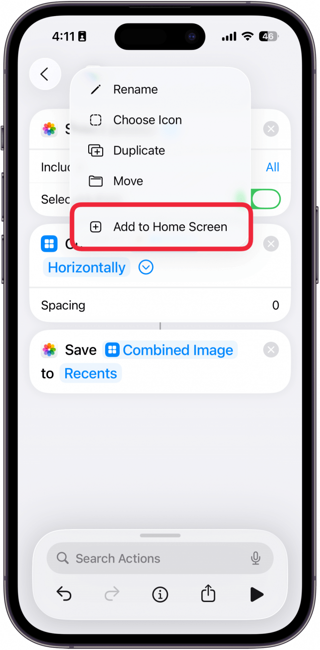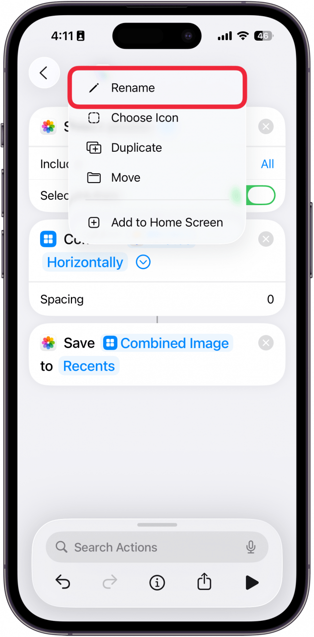 - 轻敲重命名,然后点击屏幕顶部的字段以重命名快捷方式。在此示例中,我将其命名为“并排照片”。