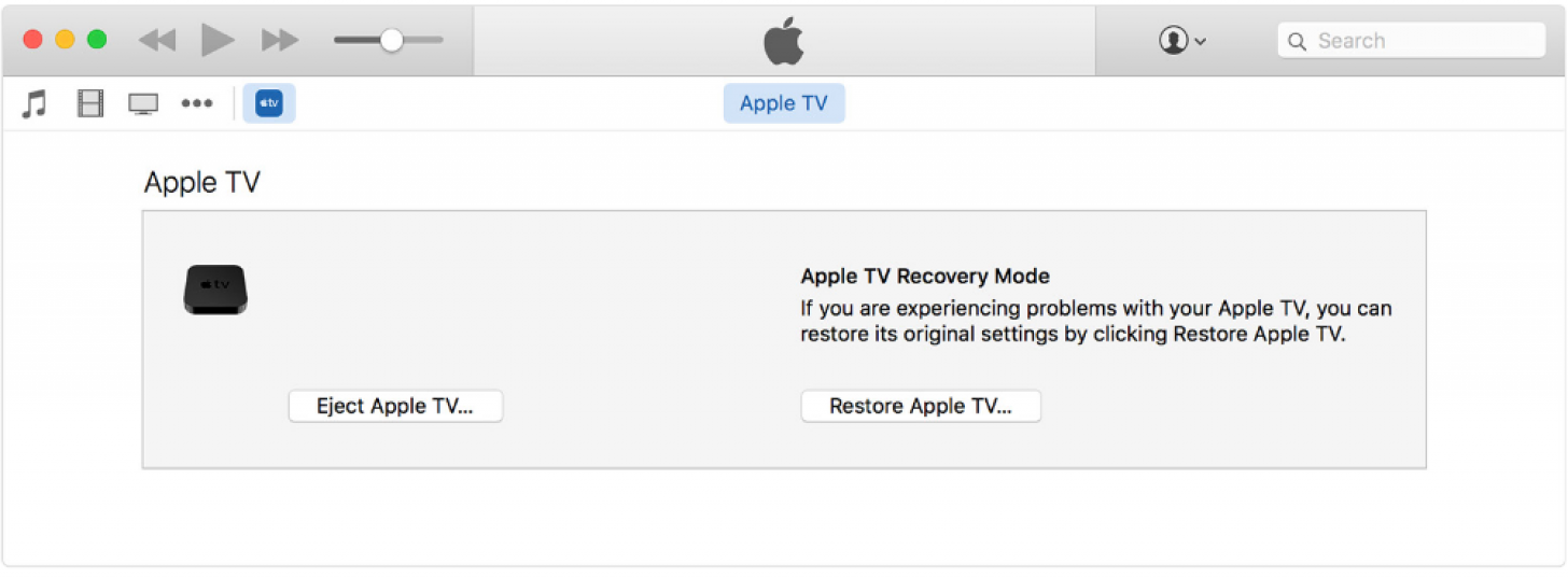 在电脑上的 iTunes 中,找到页面左上方菜单中的 Apple TV 图标。单击它可查看 Apple TV 的摘要。