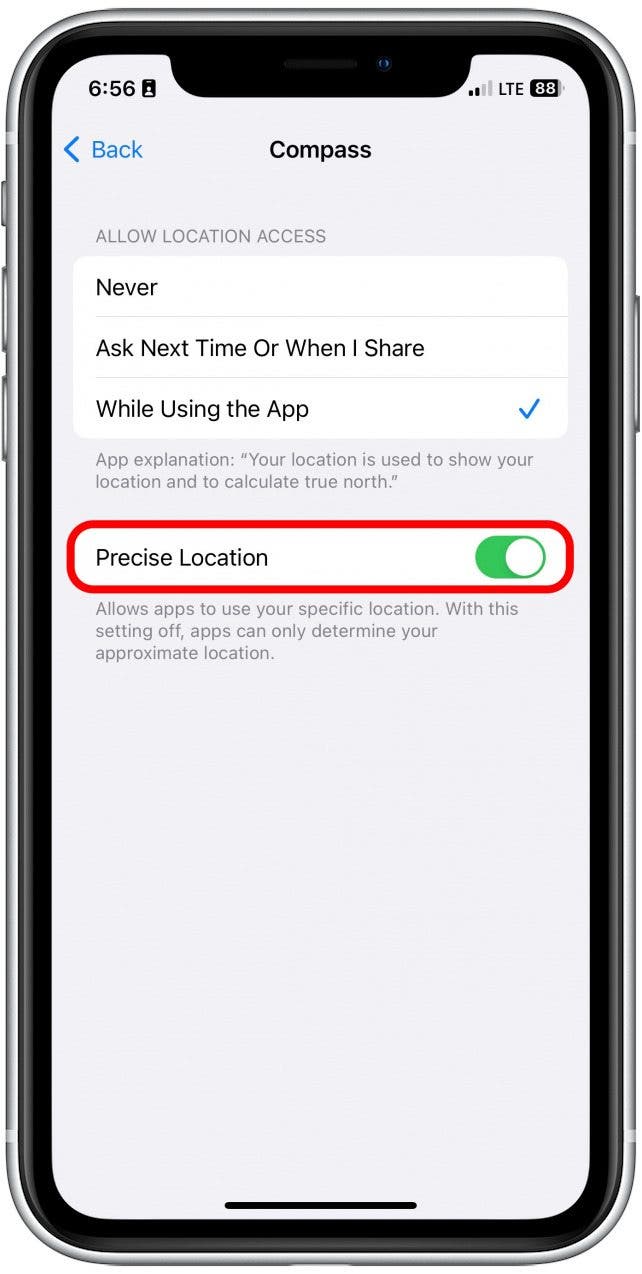 - 确保你有使用应用程序时选中以查看“精确位置”选项。然后,切换精确定位在。启用后它将呈绿色。