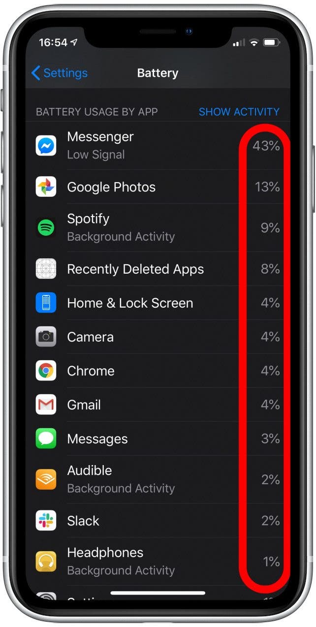 在电池菜单中,您的应用程序的电池使用情况已列出。检查异常值。对于您经常使用的应用程序来说,需要更多电池是正常的,但总是值得花点时间考虑一下应用程序的好处及其所需资源的成本。