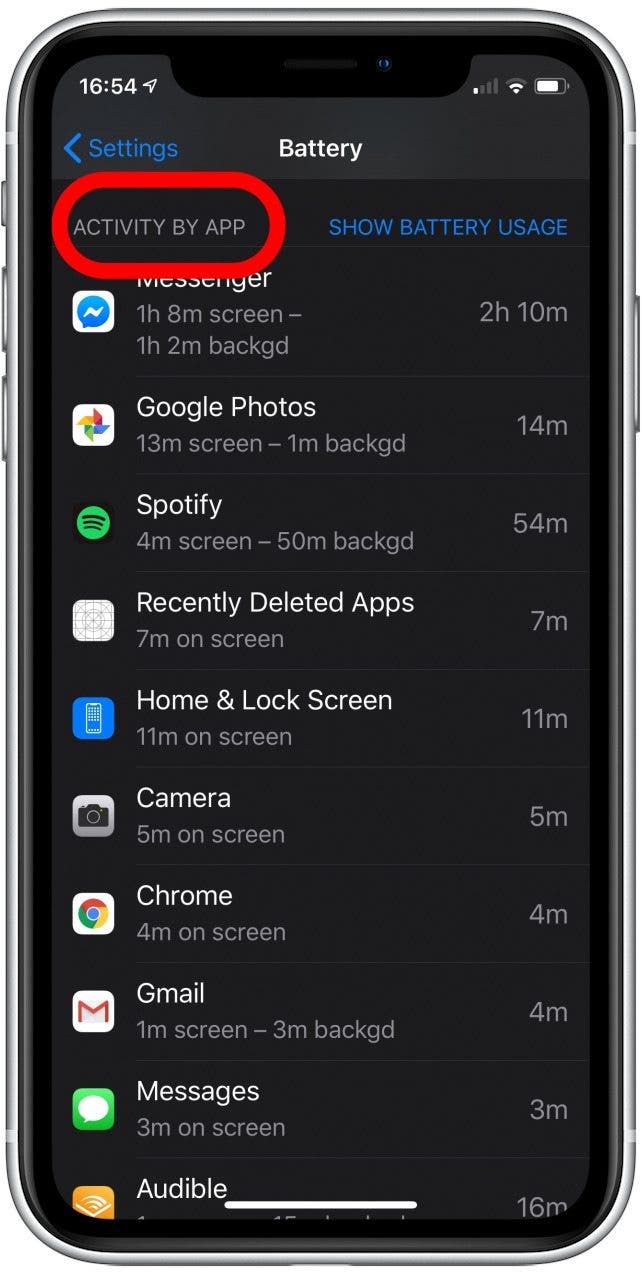 点击列表即可切换到按应用程序进行的活动并将其与应用程序的电池使用情况进行比较,以确保您使用的是使用电池的应用程序。