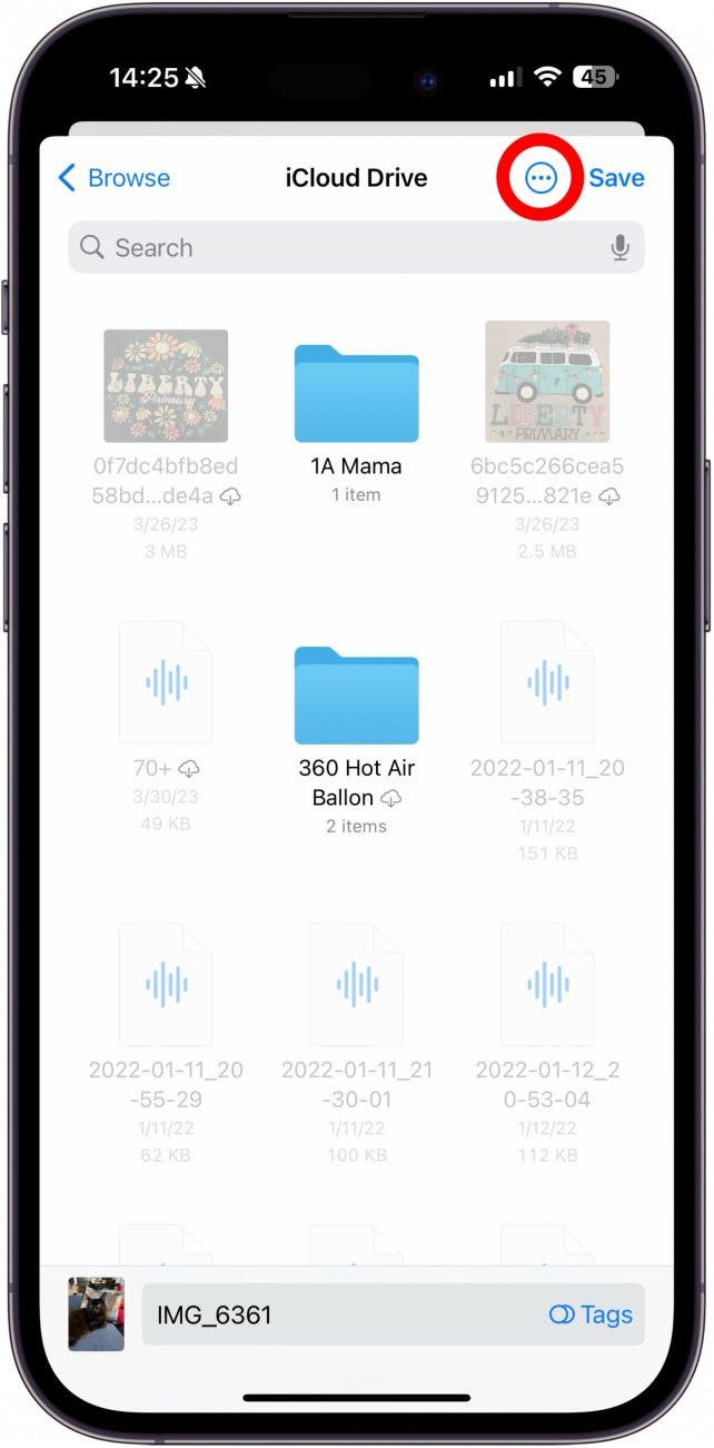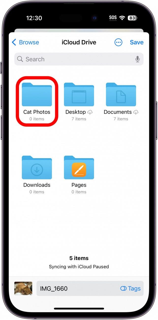 - 要将文件保存到“文件”应用程序中的现有文件夹,请点击该文件夹将其打开,然后点击节省。