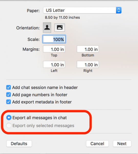 - 选择您是否愿意导出聊天中的所有消息或者仅导出选定的消息。