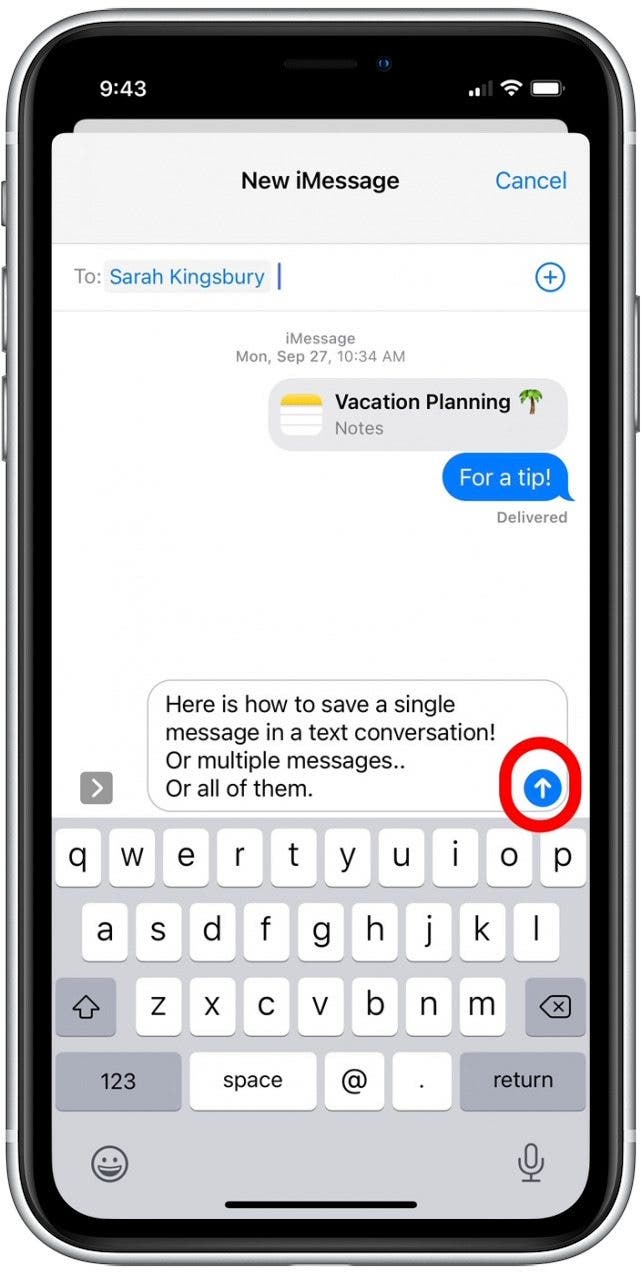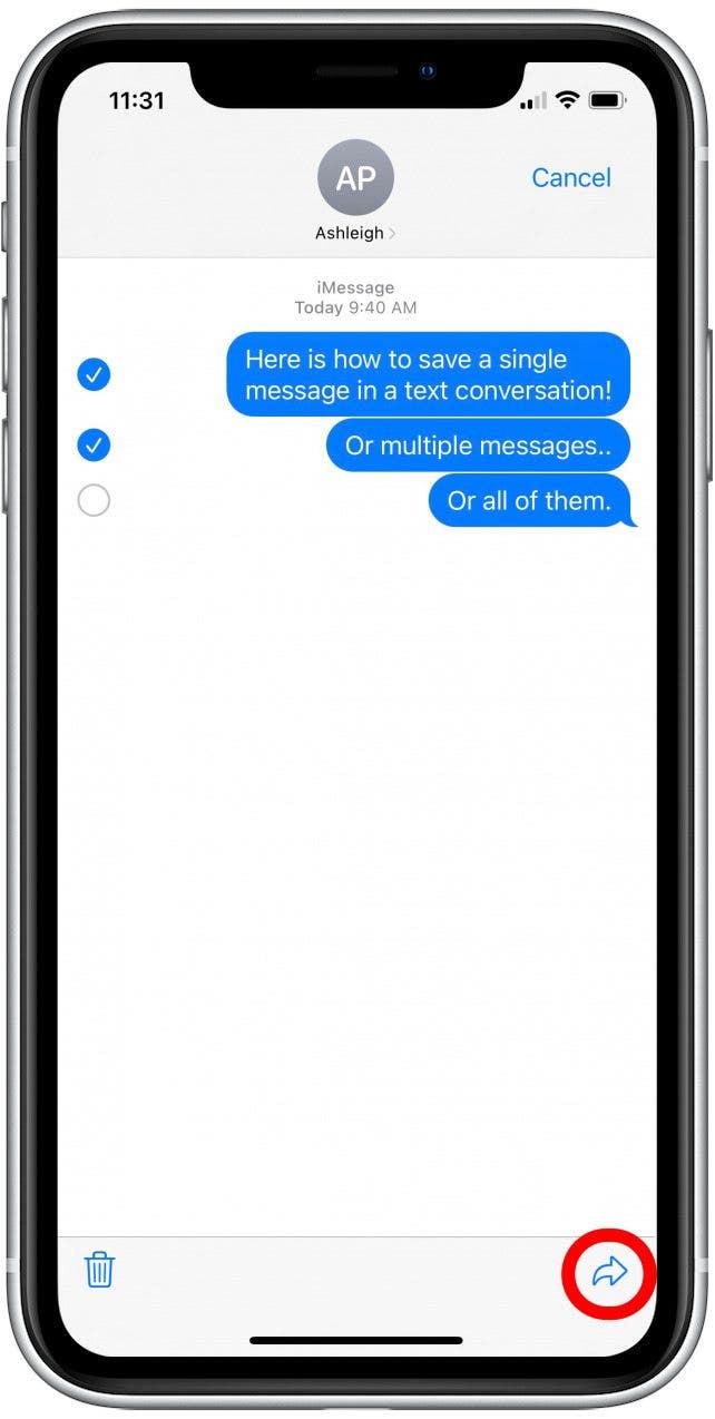 - 点击您要保存的每条短信。 (消息旁边的蓝色气泡表示它已被选中。)