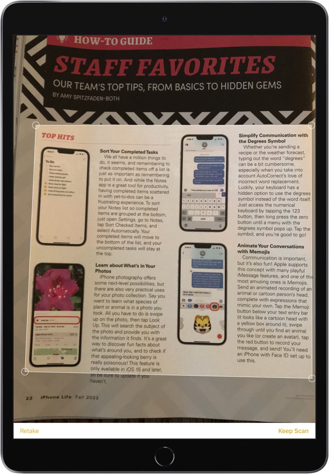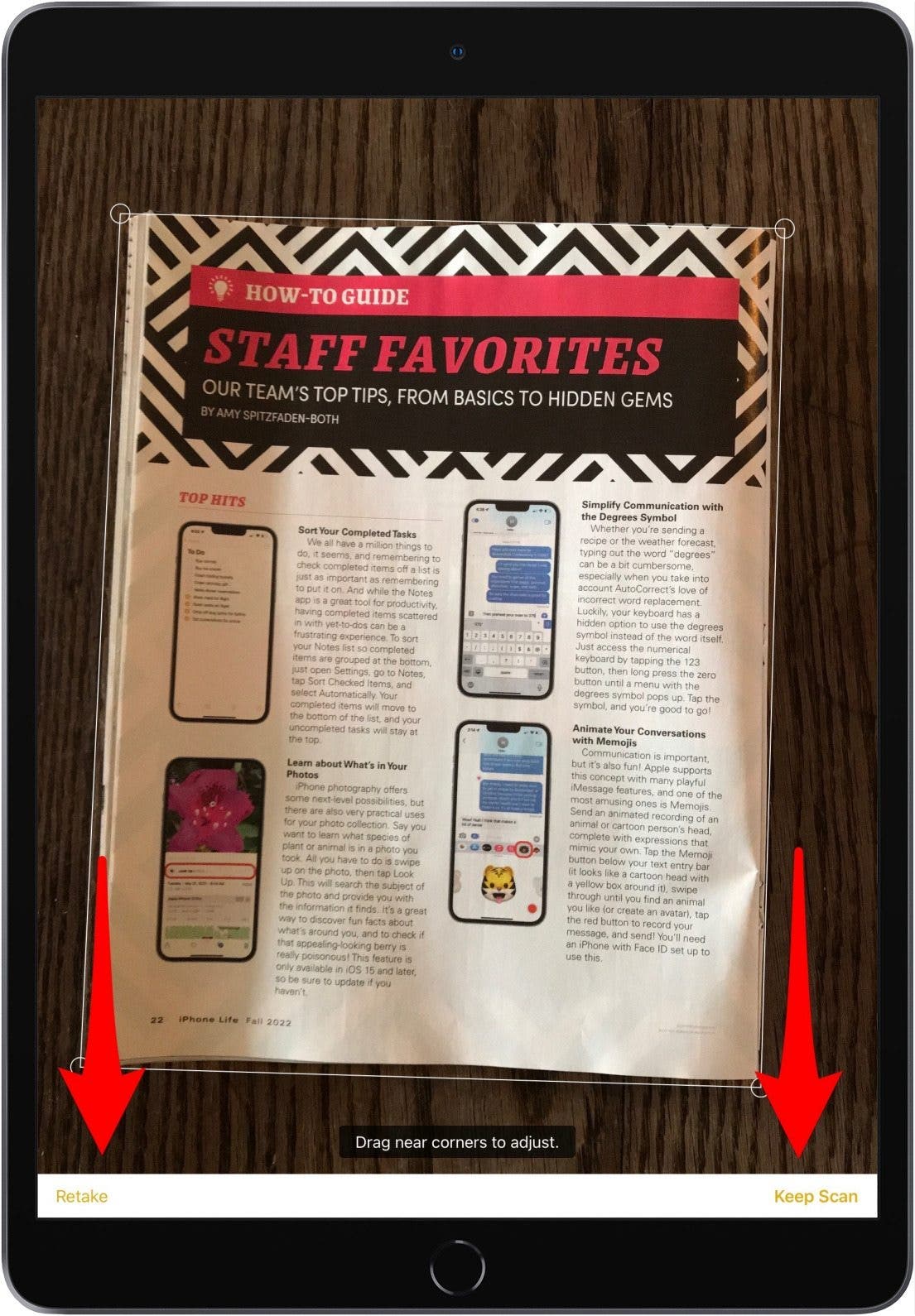 - 如果需要,触摸并拖动每个角的圆圈以调整扫描文档的大小。轻敲重拍如果扫描不符合您的标准,并且保持扫描如果扫描的文档看起来不错。