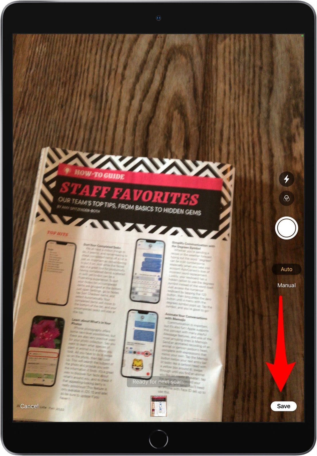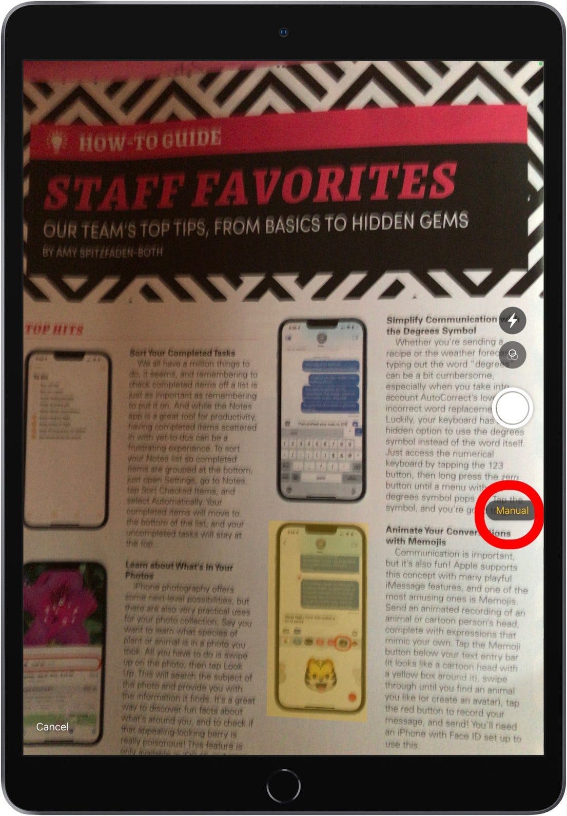 - 有时,您的 iPad 相机不会选择您要扫描的整个区域。如果发生这种情况,请点击手动的,然后点击快门按钮一旦您看到黄色轮廓区域。