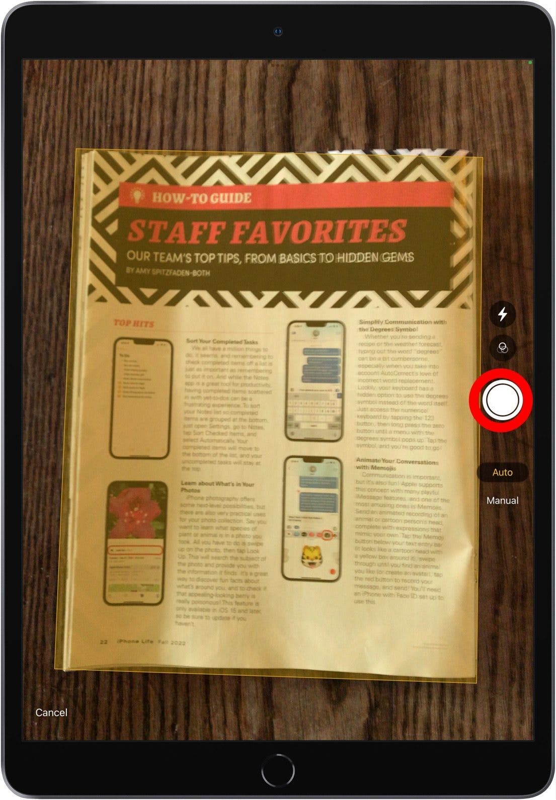 - 确保相机处于自动模式,然后将 iPad 相机放在文档上方。黄色框将指示正在扫描的区域。点击快门按钮如果这是您要扫描的区域。