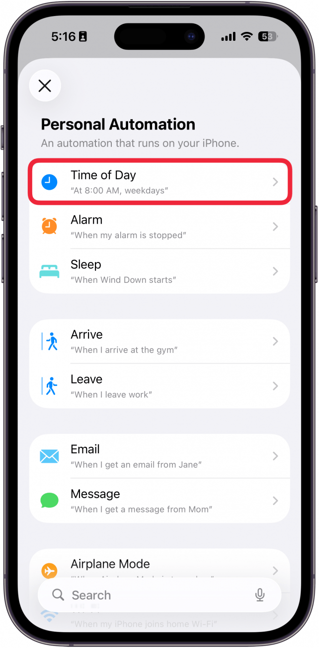 - 在“个人自动化”菜单中,选择短信提示。在这个例子中,我将使用一天中的时间安排我的文本。