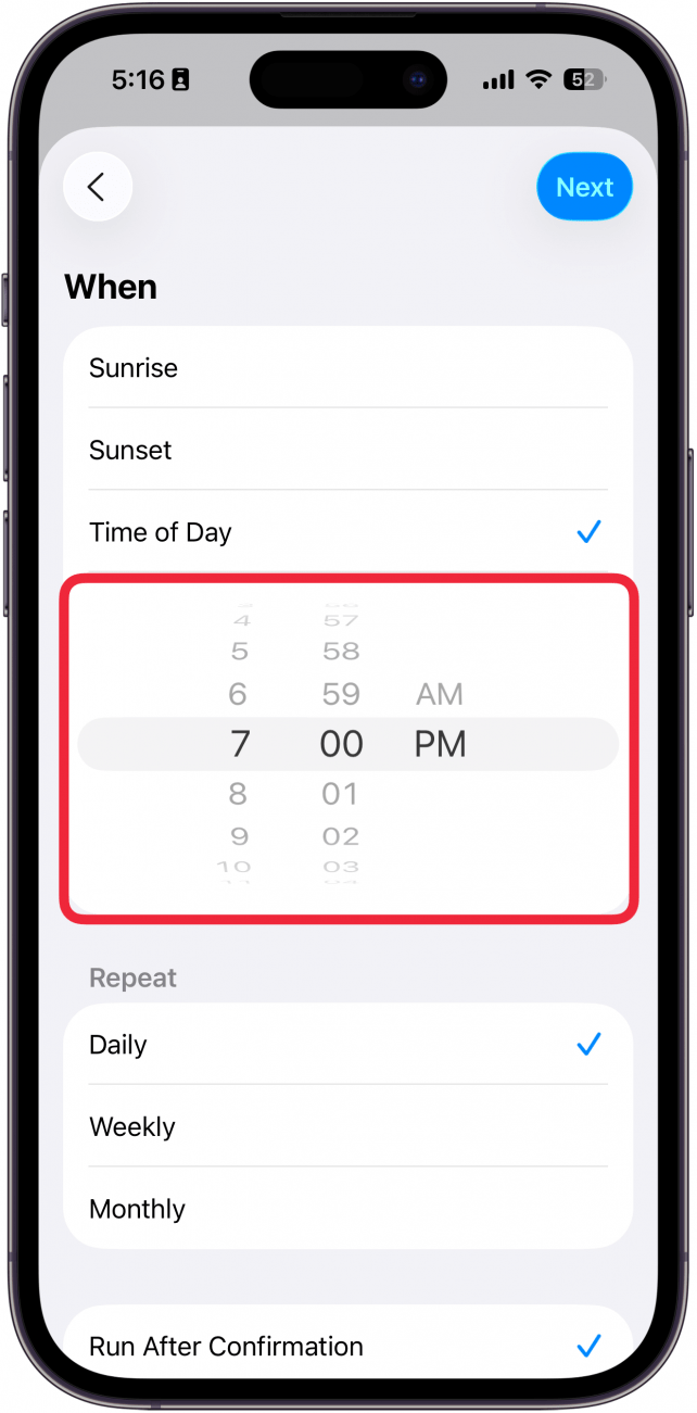 - 如果您选择一天中的时间,请点击时间并滚动以选择要发送文本的时间。