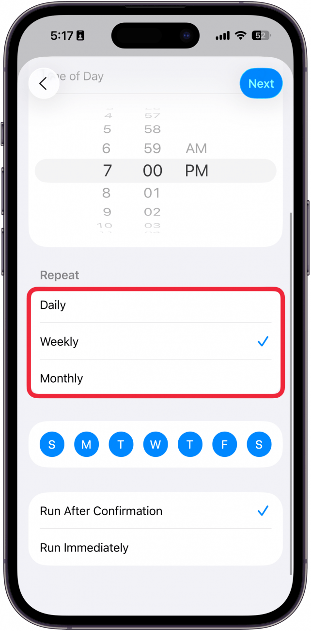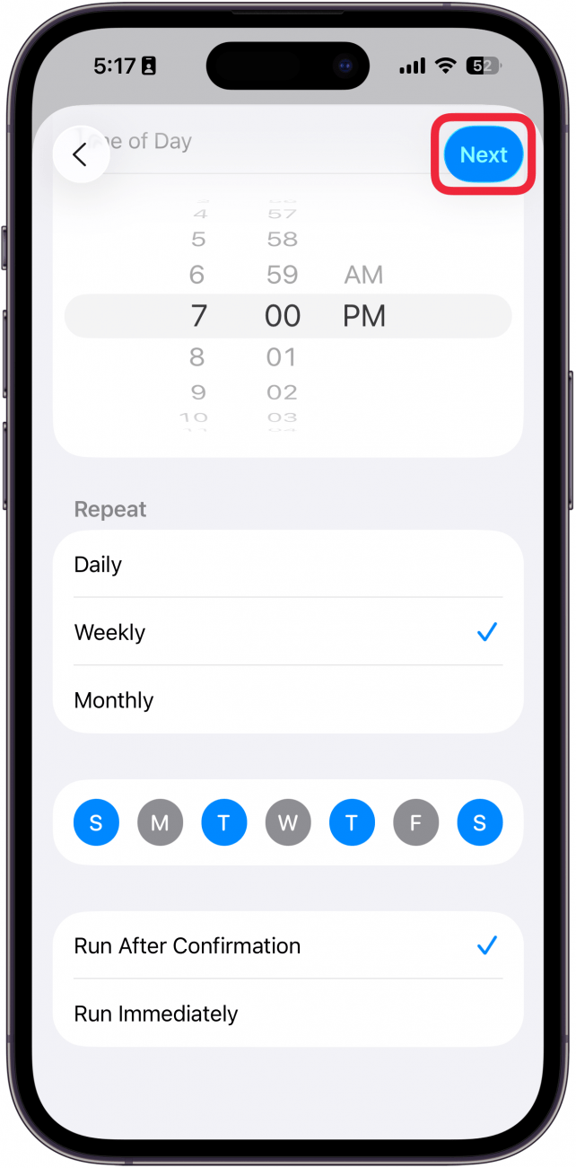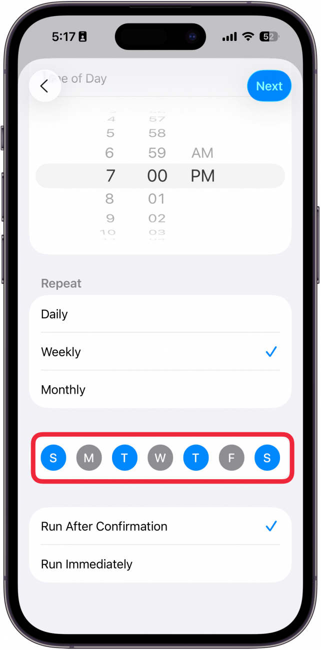 - 如果每周或每月,请选择一周或一个月中的日期。对于“每周”,将自动选择一周中的所有天,因此点击任意一天即可取消选择。