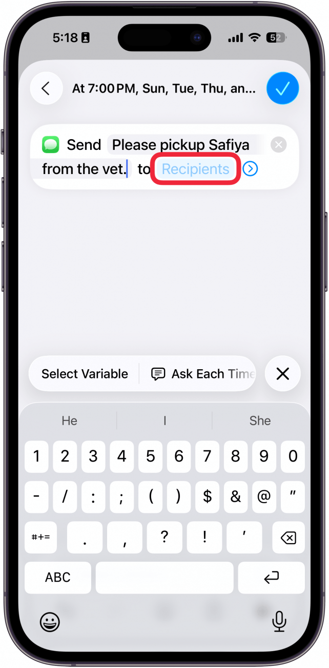 - 轻敲收件人选择您的收件人。请注意,您无法将自动文本安排到群聊中。您必须单独添加聊天的每个成员。