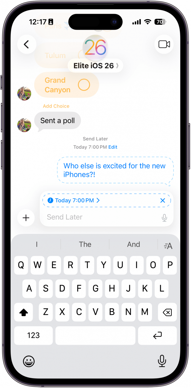 但是,这仅在您的设备运行 iOS 18 或更高版本时才有效,并且仅在发送 iMessage 时才有效。它不适用于 RCS/SMS 短信。如果您的 iPhone 仍在运行 iOS 17,或者您需要向 Android 用户发送短信,请参阅下面的快捷方式方法,了解如何在 iPhone 上安排短信。
