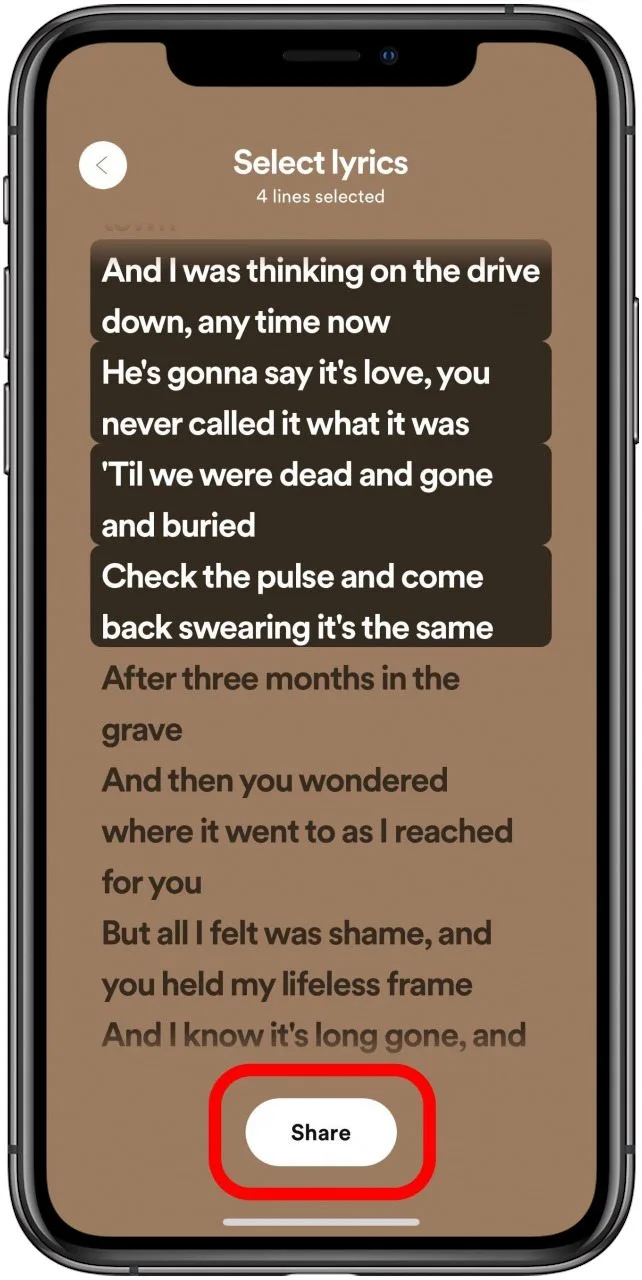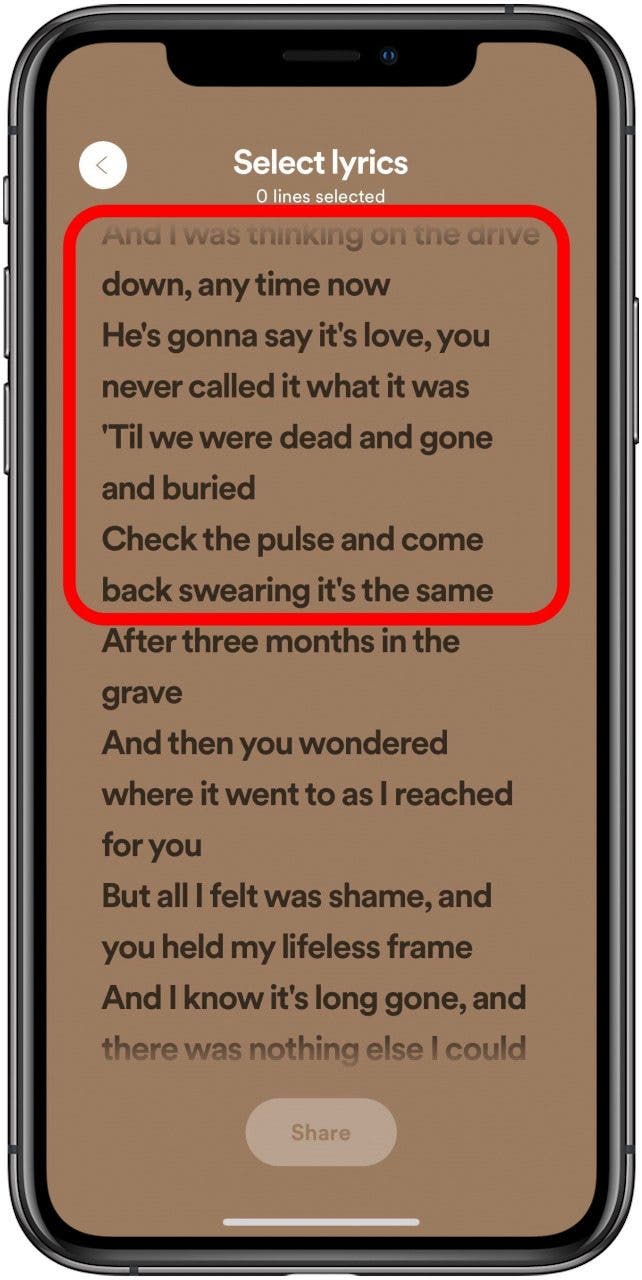 - 滚动到您想要分享的歌词。点击它们来选择它们。您最多可以选择四行。