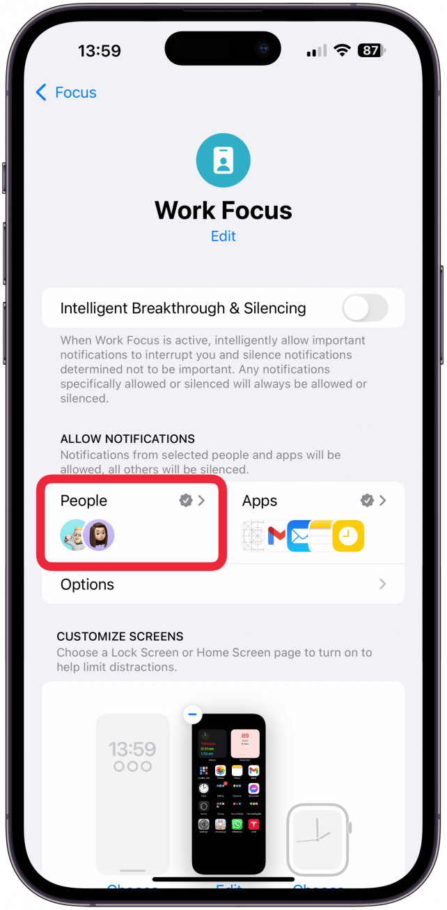 自定义您的焦点模式可以让您静音某些应用程序和/或人员,以最大程度地减少干扰并创造更好的工作与生活平衡。以下是如何让通知静音,同时允许某些人仍然联系到您,并允许紧急情况发生: