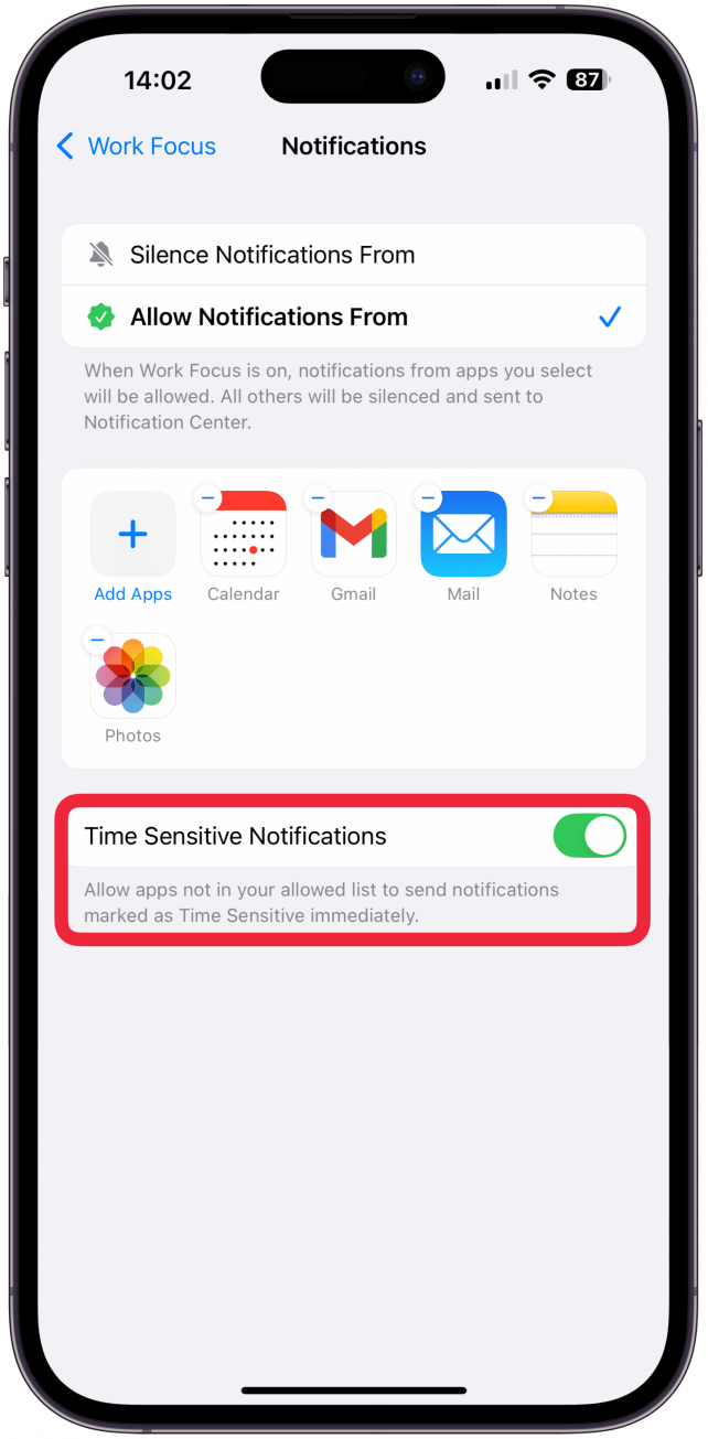 - 选择应用程序的步骤与选择人员的步骤相同。唯一的区别是,在最底部,您可以决定是否要切换时间敏感的通知打开或关闭。我建议在出现紧急情况时打开此功能,例如黑客试图登录您的社交媒体或电子邮件。您所做的任何更改都会自动保存。