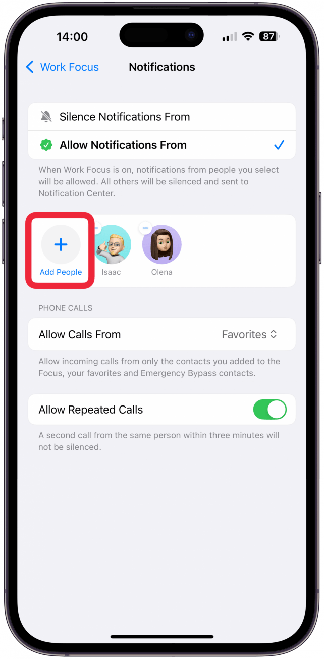 - 根据您决定静音还是允许通知,您将看到用于自定义电话呼叫权限的不同选项。如果您选择了静音通知,您可以切换允许静音的人拨打电话打开或关闭。