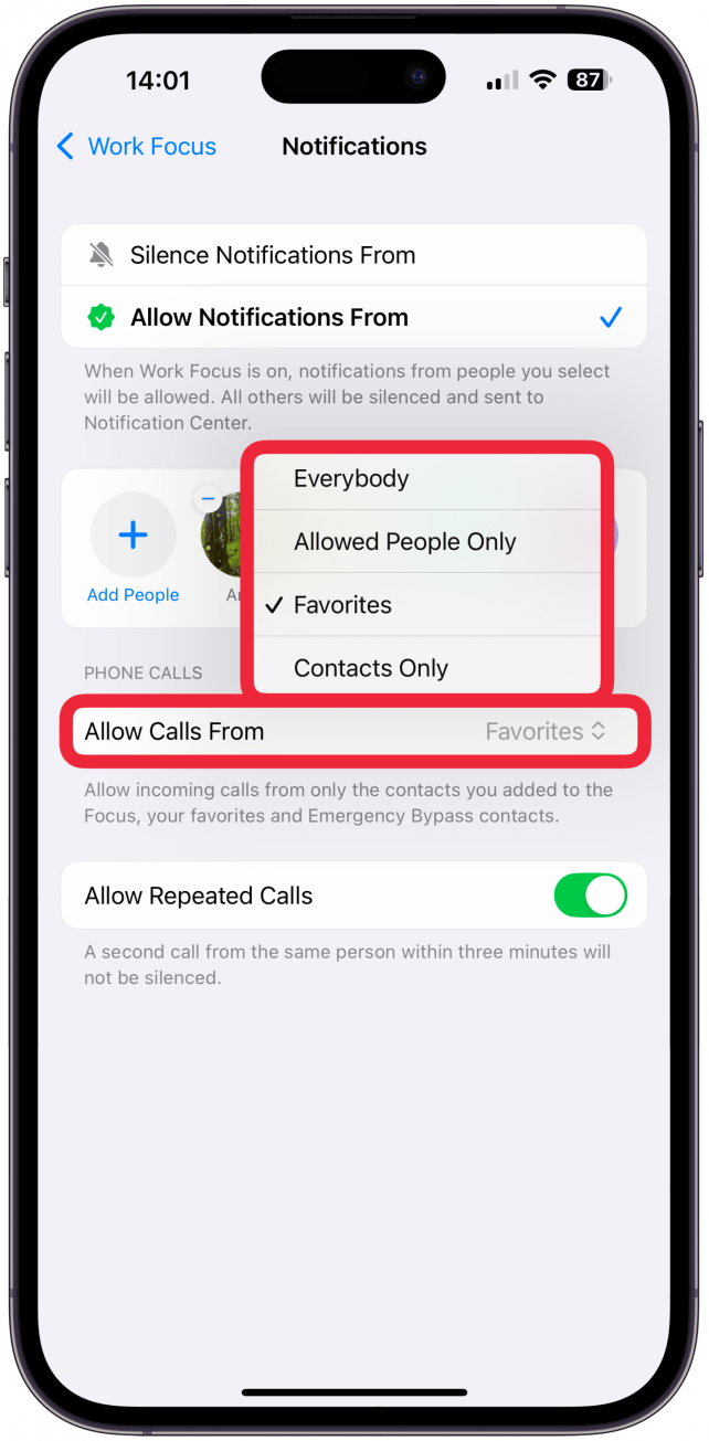 - 如果您选择允许来自某些联系人的通知,您将能够选择您希望允许哪些人来电。轻敲允许来自的呼叫并在“所有人”、“仅限允许的人员”、“收藏夹”或“仅限联系人”之间进行选择。