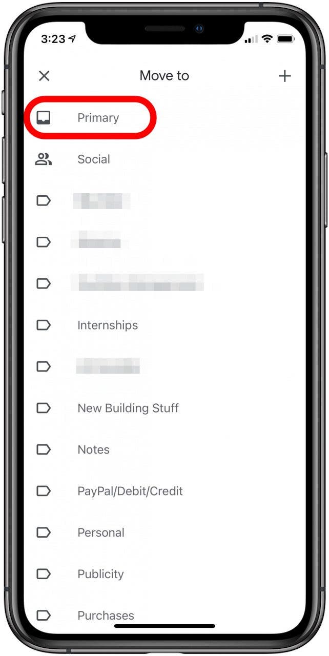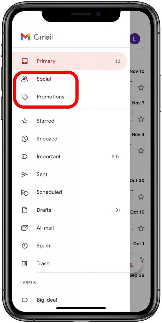 - 轻敲社会的,促销活动,或包含您要移动的电子邮件的任何类别。