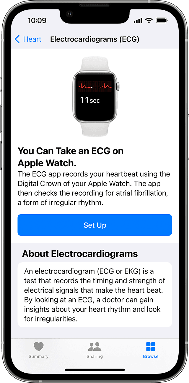 您必须先在 iPhone 的“健康”应用程序中进行设置,然后才能在 Apple Watch 上使用心电图功能。设置它需要您打开“健康”应用程序,导航到“浏览”选项卡中的“心脏”部分,然后点击“心电图”下的“设置”。设置完成后,即使您将设备重置为出厂设置并重置所有设置,它也将保持活动状态。完成此步骤后,您可以随时直接从手表上获取读数。