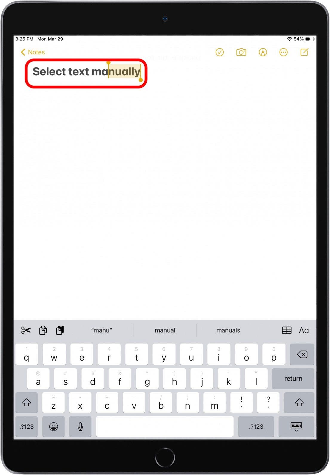 - 要选择文本,请使用此方法,然后将一根手指固定到位,同时移动另一根手指,将光标拖过要选择的文本。