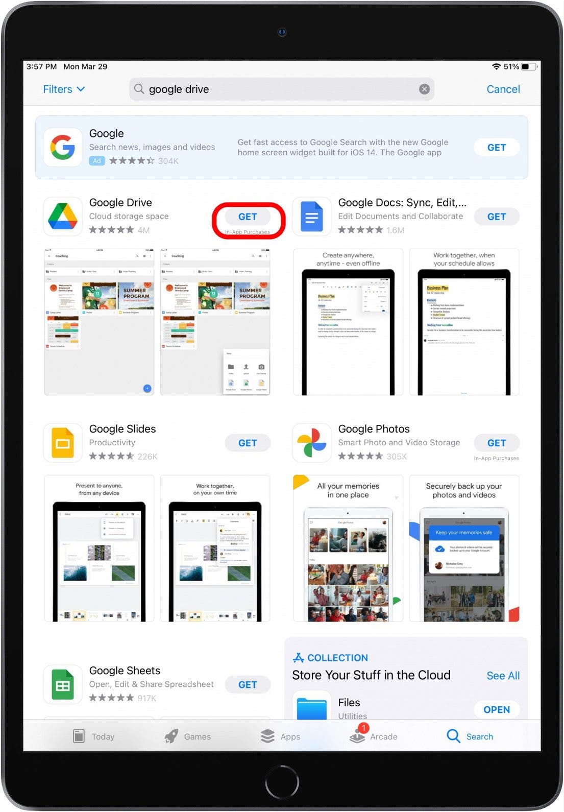 Google 的生产力套件包括谷歌云端硬盘,文档,床单, 和幻灯片。这些应用程序允许您与工作团队就文档、电子表格和幻灯片进行协作。您可能已经在使用它们,如果是这样,使用现有的 Google 云端硬盘帐户进行设置就像在 App Store 中下载应用程序一样简单。我们将逐步介绍此过程,以便您也知道在安装其他工作(或娱乐)应用程序时该怎么做。