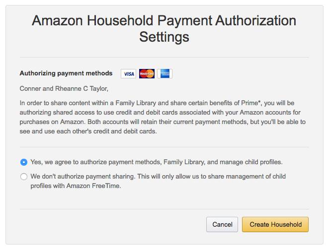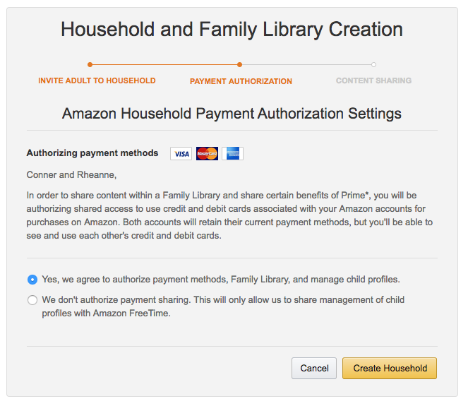 亚马逊将再次询问您想要分享多少信息。选择第一个以“是”开头的圆圈,然后点击“创建家庭”。