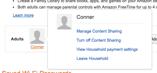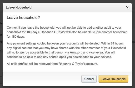 如果您尝试离开家庭或将其中的其他成人带走,亚马逊将警告您,这样做将导致您和其他成人在 180 天内无法加入新的亚马逊家庭。