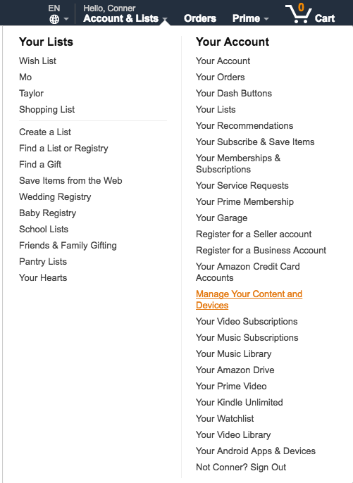 在右上角附近,将鼠标悬停在帐户和列表上。
