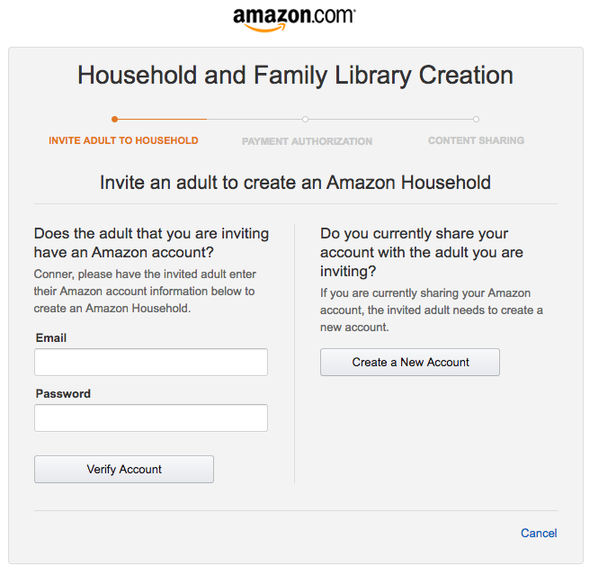 如果其他成年人已经拥有自己的帐户,请让他们使用自己的亚马逊电子邮件和密码登录此页面,这将允许亚马逊创建一个家庭。输入帐户信息后,选择验证帐户。