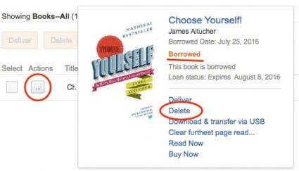 找到您要归还的书。点击该书复选框旁边的三个点(称为“操作”按钮)。选择删除。