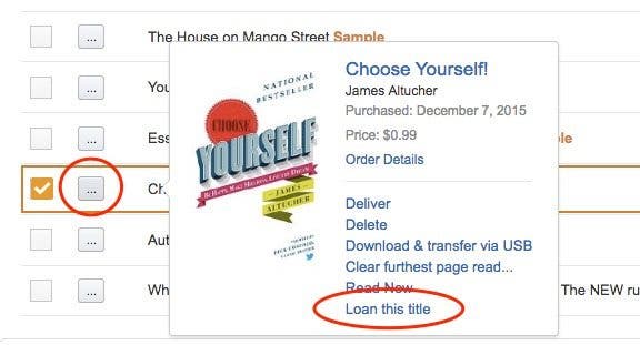 选择您想要借出的 Kindle 图书旁边的复选框。然后单击复选框旁边的三个点(称为“操作”按钮)。从弹出的选项中,选择借出该作品。