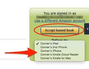 在贷款接受页面的左侧,您会看到一个绿色框。从下拉列表中选择要将借出的图书传送到的设备。