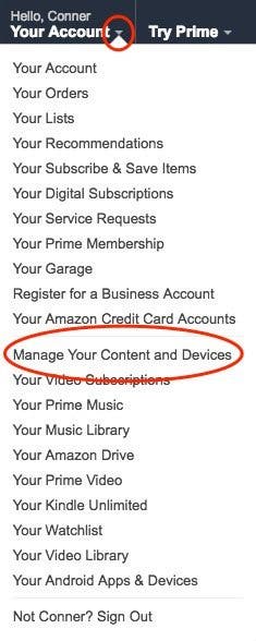 将鼠标悬停在“您的帐户”旁边的箭头上以显示“设置”下拉菜单。从此菜单中,单击管理内容和设备。