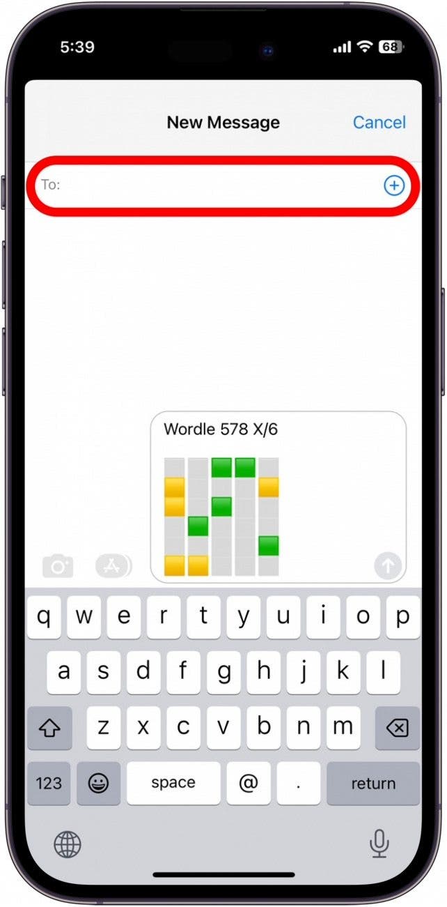 - 如果您选择一个应用程序,您的 Wordle 分数将显示在消息草稿中。输入至少一位收件人的姓名。